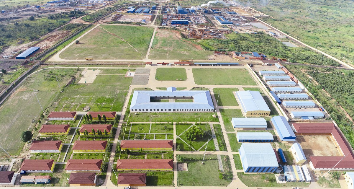 3月的非洲大地绿意盎然,从高空鸟瞰穆索诺伊公司,厂区与外部草原实现了自然有机融合,红瓦蓝瓦白墙与绿树相互点缀、相映成趣、生机盎然。