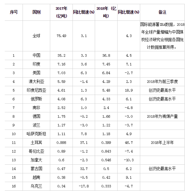 2018年世界主要煤炭生产国产量变化情况