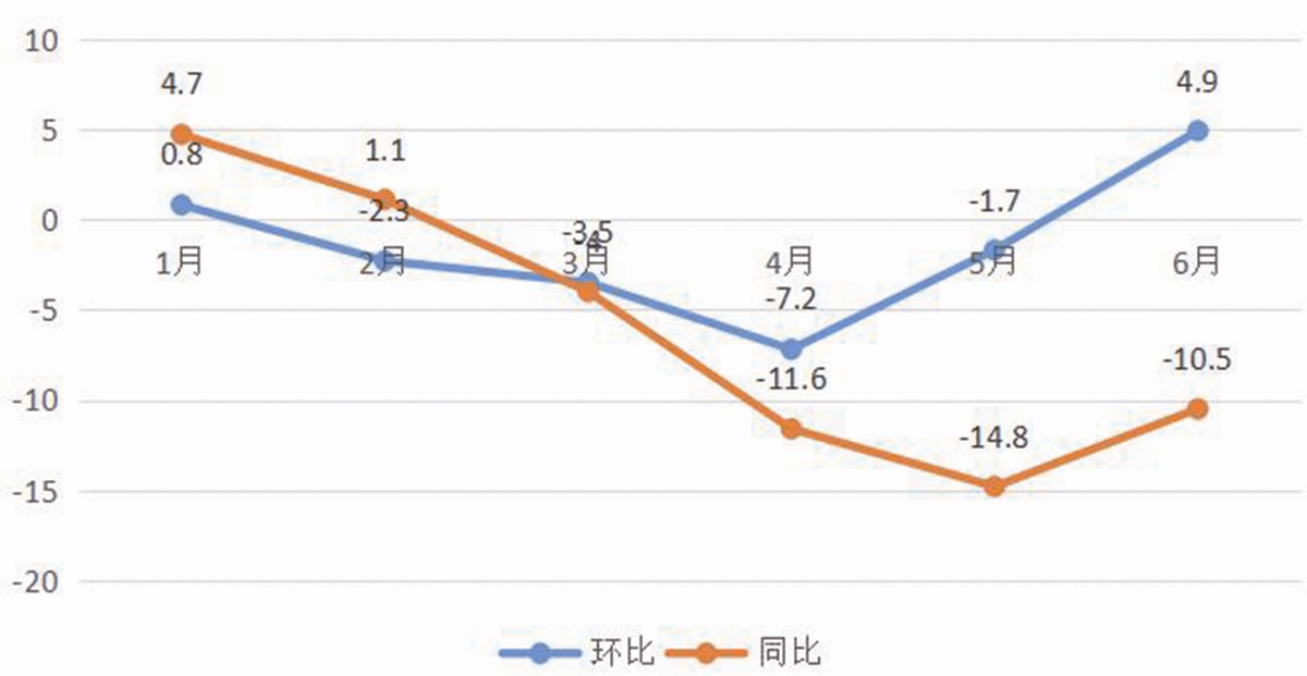 下游方面,原材料工业出厂价格环比由降转涨,同比降幅收窄:6月份,原材料工业出厂价格环比上涨0.7%,同比下降8.5%,上半年同比下降5.9%。其中,石油、煤炭及其他燃料加工业价格环比上涨1.7%,同比下降21.6%,上半年同比下降12.3%;化学原料和化学制品制造业价格环比上涨0.4%,同比下降7.9%,上半年同比下降6.5%;黑色金属冶炼和压延加工业价格环比上涨1.9%,同比下降5.1%,上半年同比下降4.1%;有色金属冶炼和压延加工业价格环比上涨1.9%,同比下降2.2%,上半年同比下降2.2%;非金属矿物制品业价格环比下降0.3%,同比下降2%,上半年同比下降0.8%。□