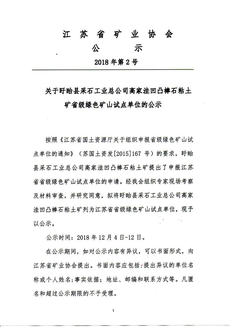关于盱眙县采石工业总公司高家洼凹凸棒石粘土矿省级绿色矿山试点单位的公示
